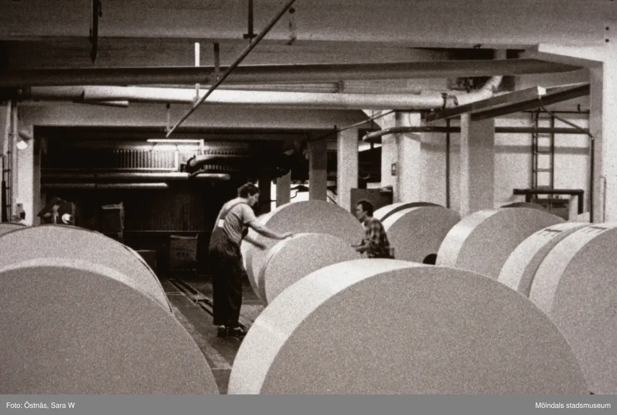 Stefan Roslund och Lennart Landh i arbete med kartongrullar på Papyrus i Mölndal, år 1990.