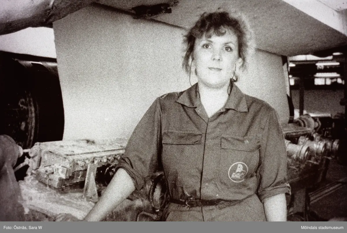 Anja Elki vid maskin på Papyrus i Mölndal, år 1990.