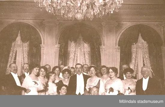 "Silfverbröllpet 21 febr. 1914" på Gunnebo slott. Längst fram i mitten står friherre Carl Sparre och hans maka Hilda Sparre. Framför dem sitter Hildas mor Jeanna Denninghoff. Troligtvis är den gråhårige mannen till höger direktör Oscar Ferdinand Larsson* (1830 - 1916). Kvinnan till vänster om Oscar kan mycket väl vara hustrun Katharina Larsson-Janzon (1851 - 1923).