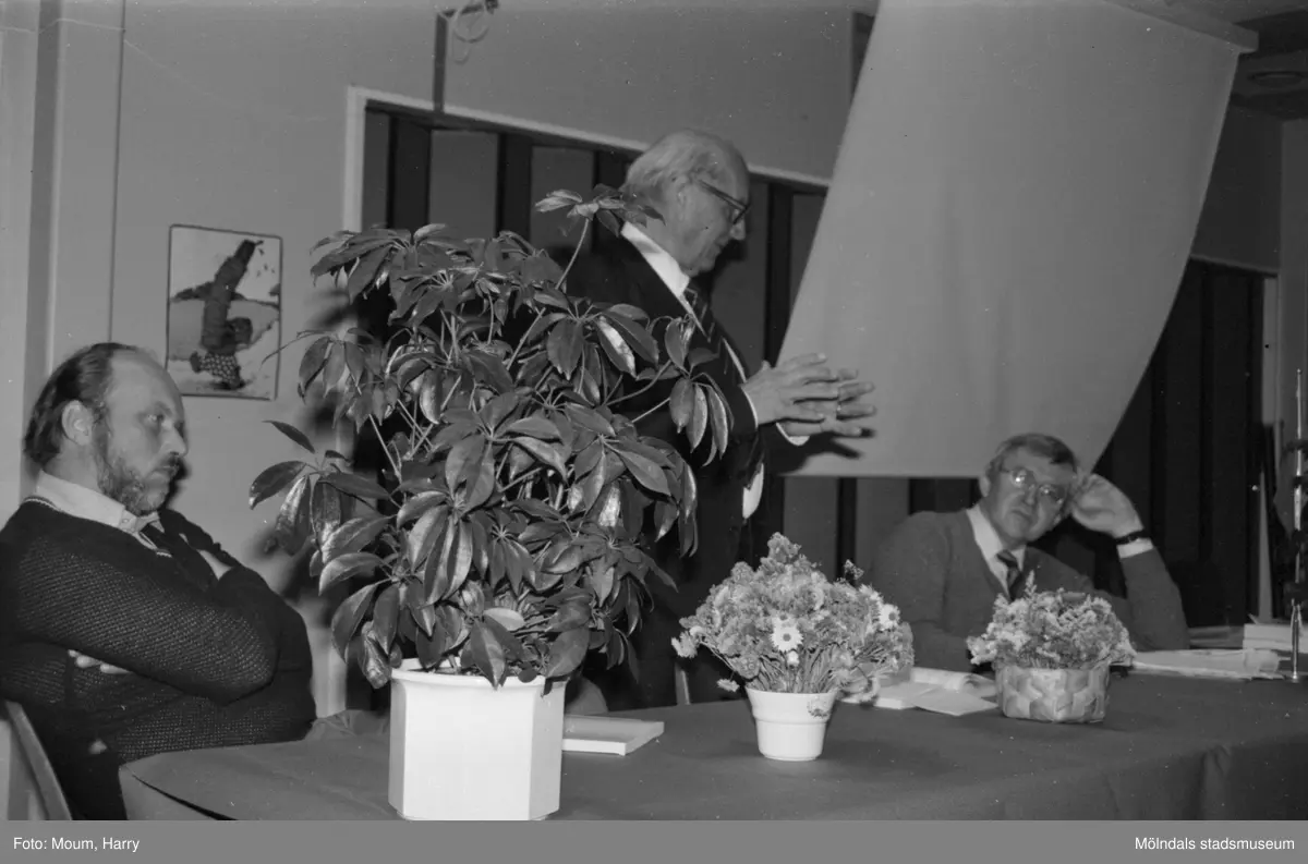 Centern anordnar en informations- och diskussionskväll om miljö och naturens resurser på Rävekärrsskolan i Mölndal, år 1984. "Nils Dahlbeck, som ett helt liv har arbetat för bra miljö och livskvalitet förklarar problemen med den globala miljöförstörelsen för Erik Arrhenius, Jimmy Stigh och en stor skara åhörare."