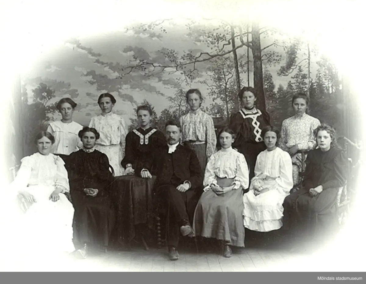 Klassfoto från Götiska Förbundets friskola 1899 - 1905. Götiska förbundet i Mölndal var en realskola eller en sorts fortsättning på folkskolan. Med på bild är prästen Axel Mauritz Sager och den första stående person från höger är Valdeborg Johansson från Olas stuga i Kållererd.