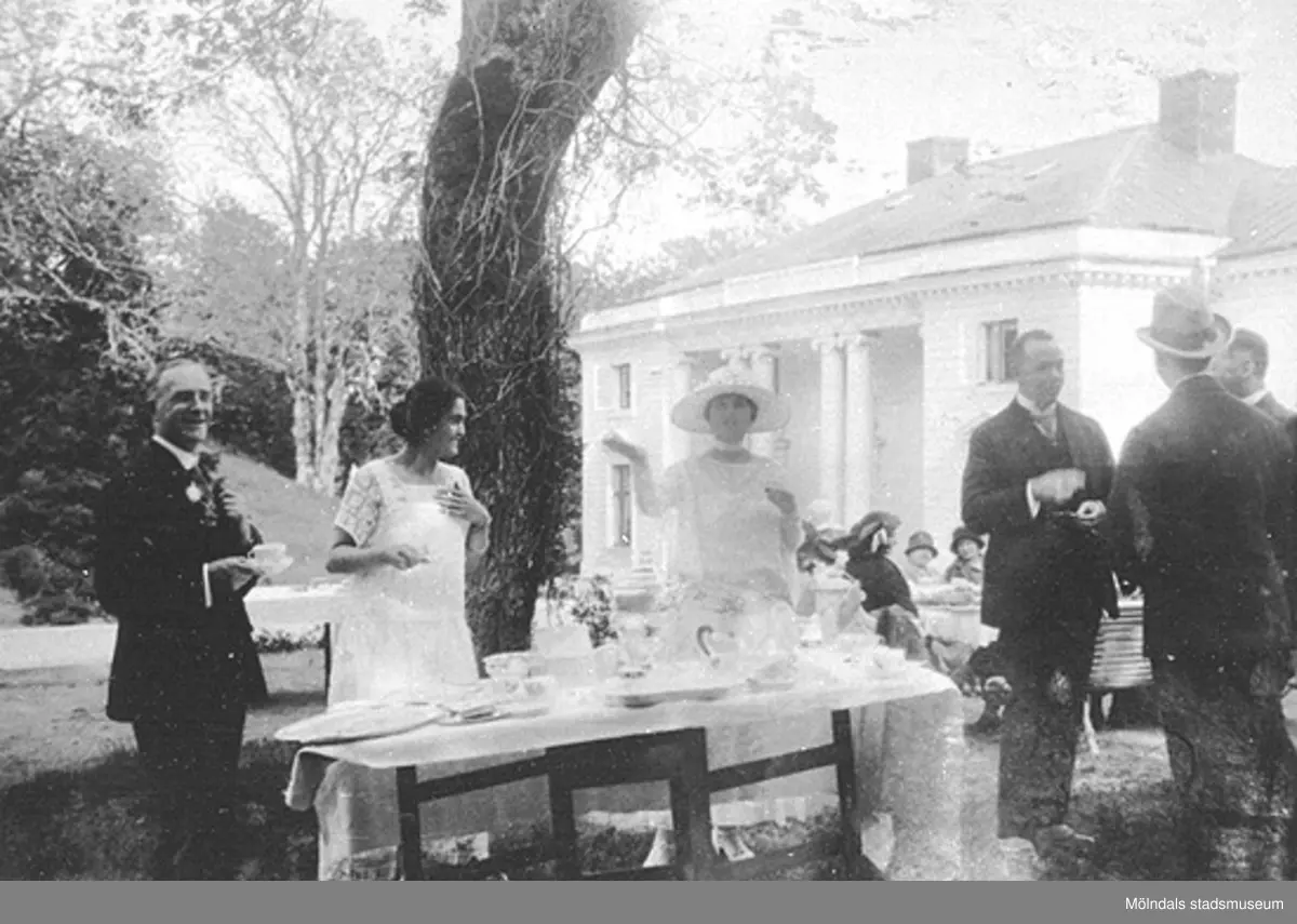 Internationellt pressbesök på Gunnebo slott den 22 juli 1923. Pressfolk ståendes utomhus vid ett kaffebord på Kejsareterrassen vid Gunnebo slott. Andra person från vänster är Margareta Sparre. Påskrift: "Internationella pressbesöket".