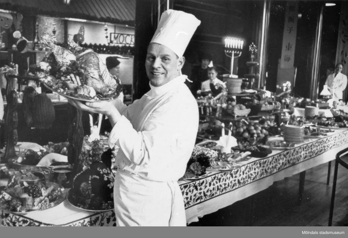 Gunnebo slotts egen kock Ruben Bohm (anställd 1938-1943). Han står med ett fat i handen bredvid ett långbord fyllt med mat. I bakgrunden ses serveringspersonal, 1940-tal.