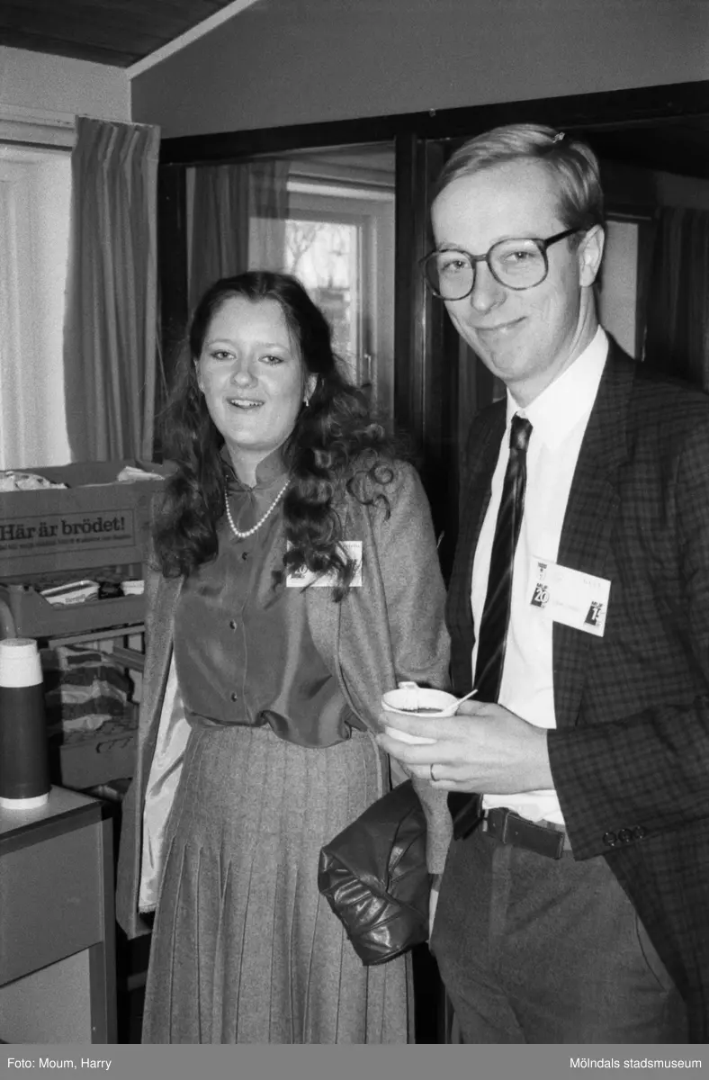 Bohusdistriktet av Moderata Ungdomsförbundet har sin distriktsstämma i Sinntorpsskolan i Lindome, år 1985. "Distriktsordf. Gunilla Sjöberg i samspråk med förre MUF-ordföranden Gunnar Hökmark."
