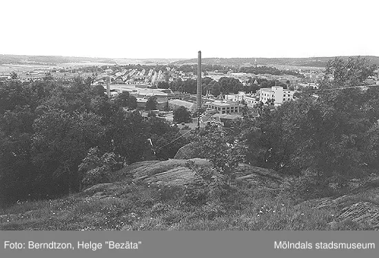 Utsikt över Mölndal från resterna av syratornets vattenreservoir, cirka 1984.