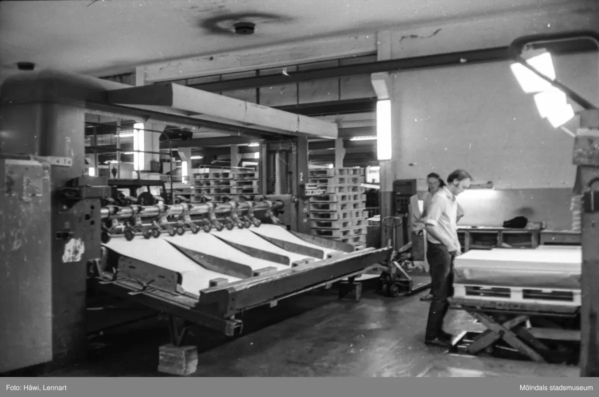Män i arbete vid maskin på pappersbruket Papyrus i Mölndal, hösten 1970. KM 2 klipp. Byggnad 6.