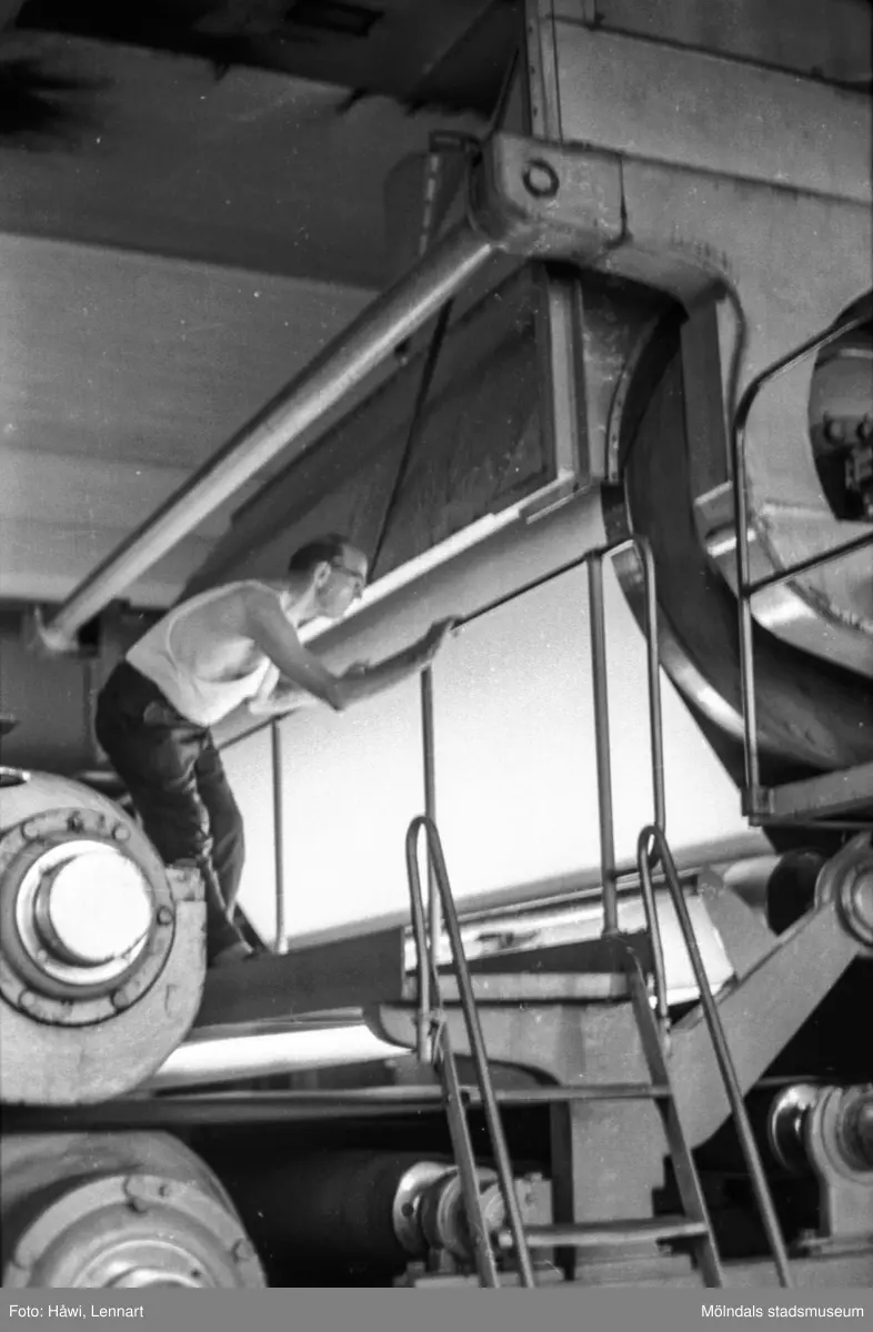 Man i arbete på pappersbruket Papyrus i Mölndal, hösten 1970. KM 2, byggnad 6. Mannen inspekterar kartongen. Mannen på bilden David Berndtsson?