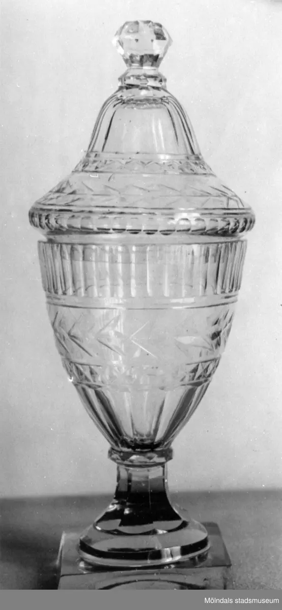 Glaspokal med lock, slipad dekor, irländsk, ca 1800. Gunnebo slott, 1930-tal.