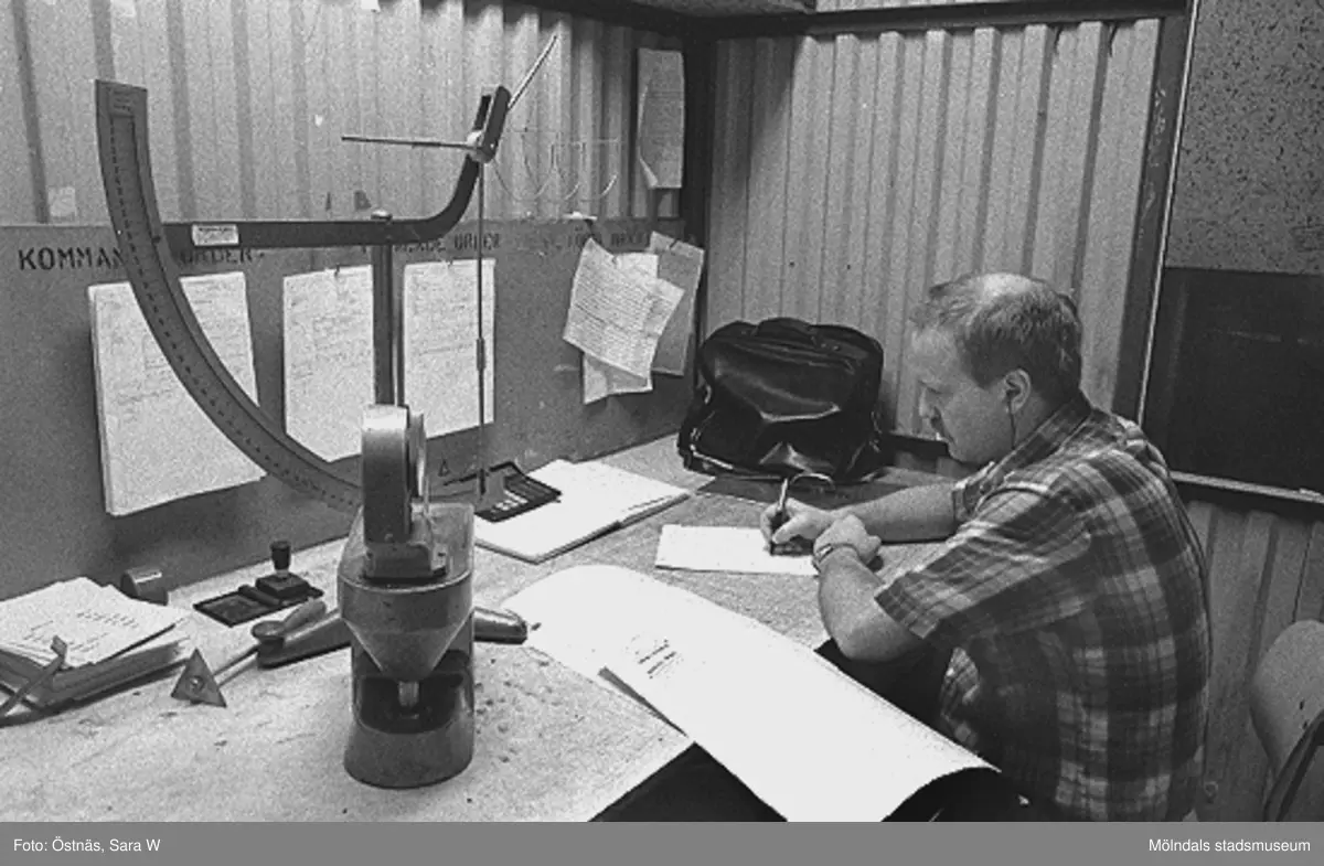 Thomas Lindell i arbete med att kontrollera kartongkvalitén, Byggnad 6. Bilden ingår i serie från produktion och interiör på pappersindustrin Papyrus, 1980-tal.