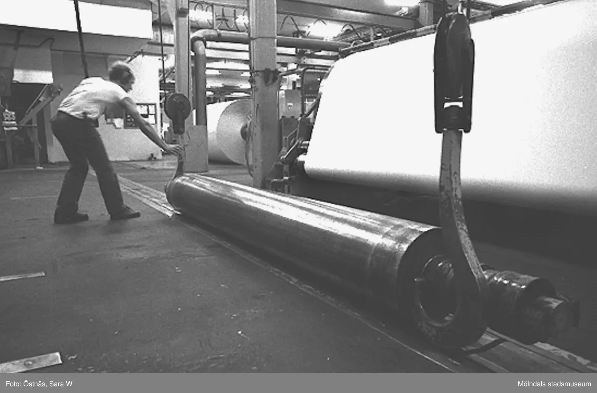 Jan Callesen i arbete med en tomtambour i Byggnad 6. Bilden ingår i serie från produktion och interiör på pappersindustrin Papyrus, 1980-tal.