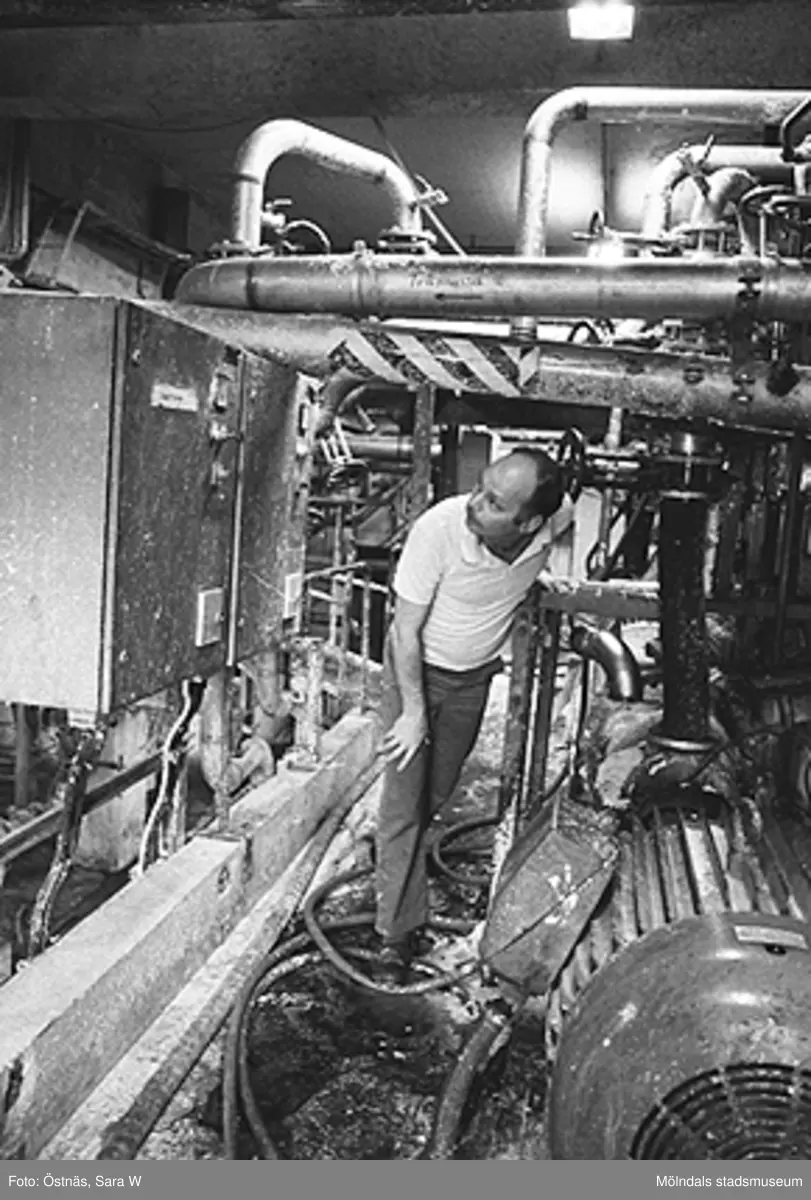 Denny Andersson i arbete i Byggnad 6, 1980-tal. Bilden ingår i serie från produktion och interiör på pappersindustrin Papyrus.
