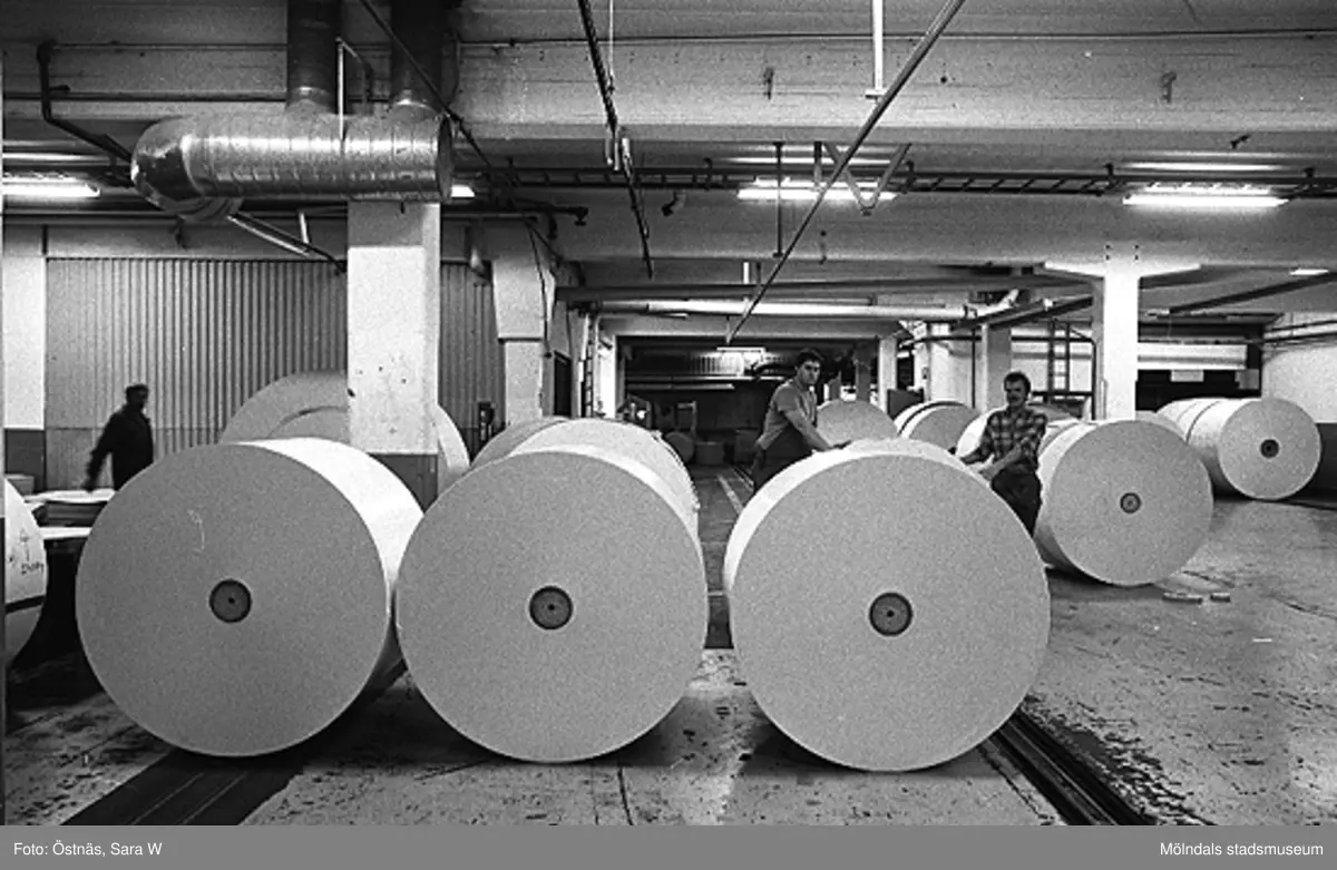 Till höger står Stefan Roslund och Lennart Landh vid kartongrullarna på bottenvåningen i Byggnad 6, 1980-tal. Bilden ingår i serie från produktion och interiör på pappersindustrin Papyrus.