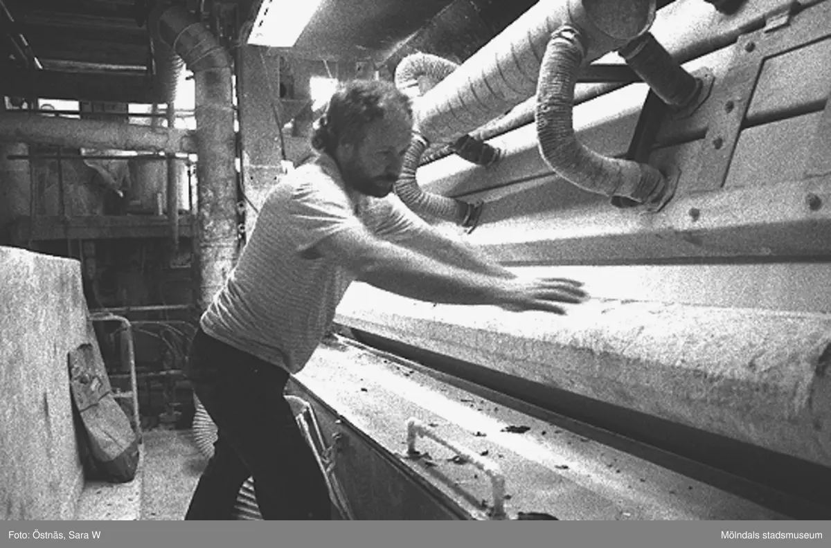 Juris Kuvalds arbetar vid ett bestrykningsverk för kartongtillverkning i Byggnad 6, 1980-tal.