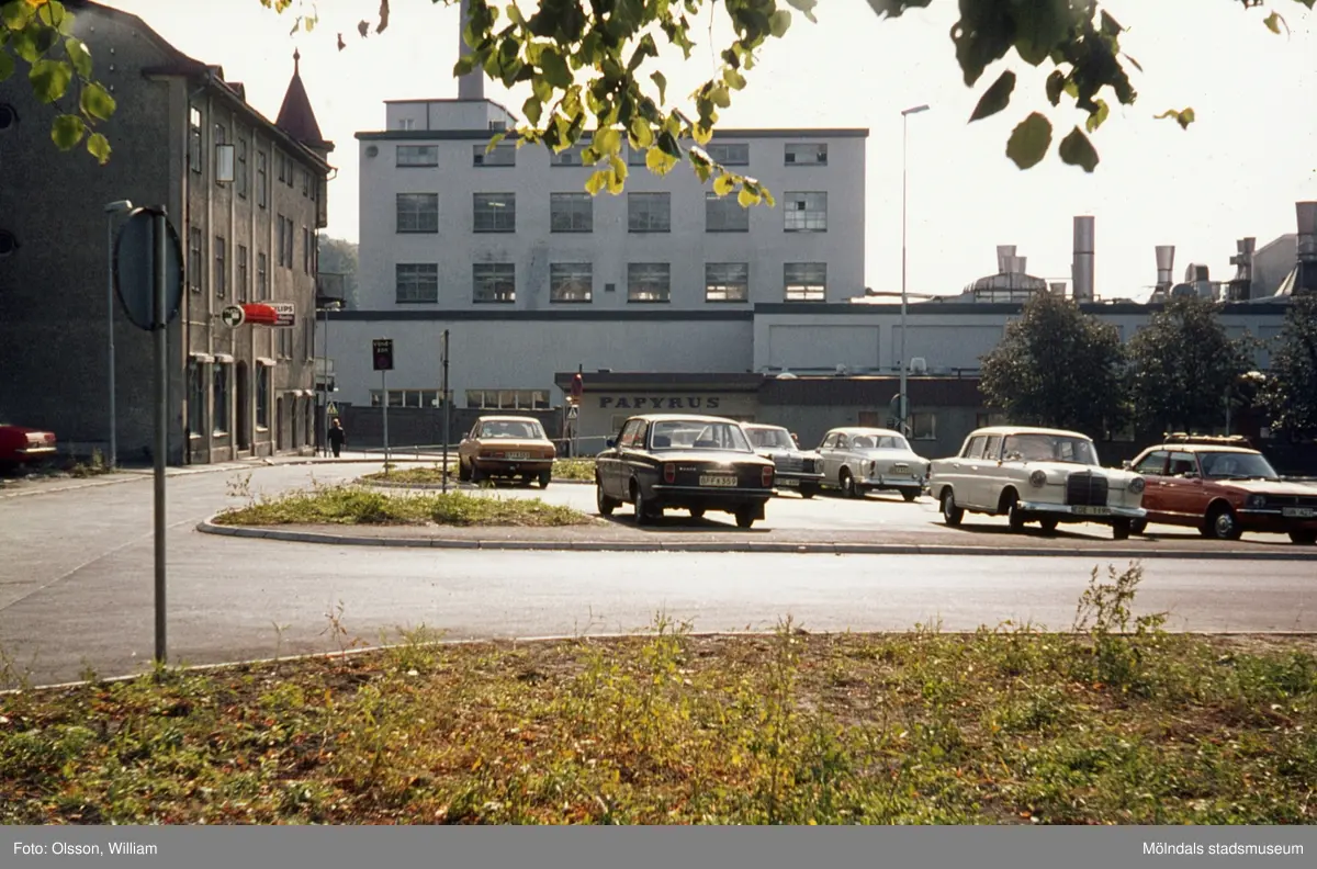 Trädgårdsgatans södra del, okänt årtal. Bostäder till vänster (Trädgårdsgatan 4) med tillhörande parkeringsplatser. Rakt fram ses Kvarnbygatan och Papyrus industriområde.