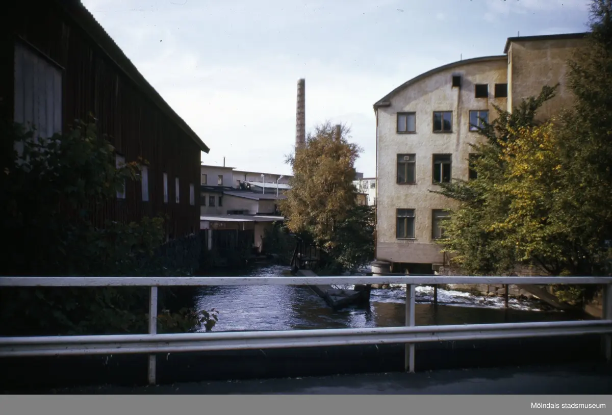 Utsikt från Rackarebron över Mölndalsfallen i Mölndals Kvarnby på 1970-talet. Till vänster ses ett gammalt magasin från 1800-talet och till höger ses gaveln till "Strumpan", Kvarnbygatan 10-14.