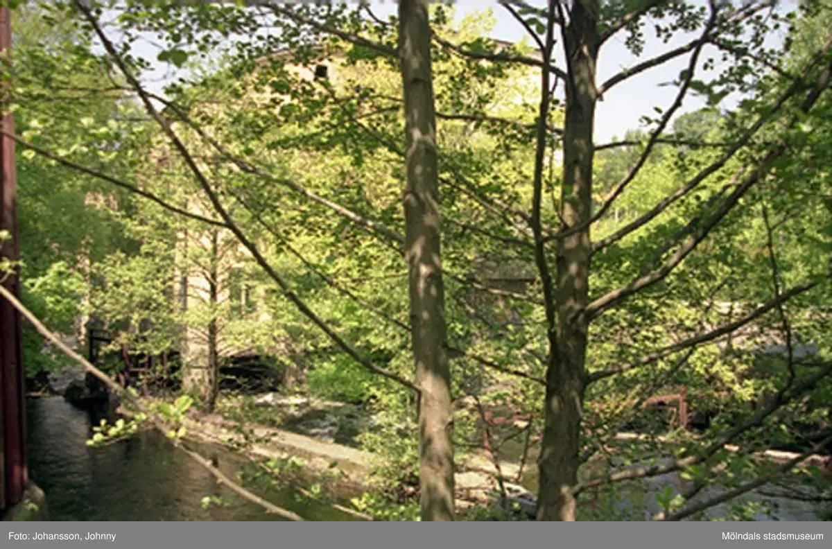 Vy genom växlighet vid Royens gata, över forsen och på f.d strumpfabriken "Strumpan" (efter Viktor Samuelsons fabrik), år 2000.