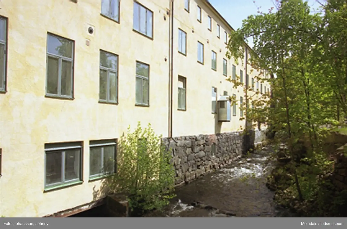 Vy från gångbron vid "Brända tomten" på f.d strumpfabriken "Strumpan" (efter Viktor Samuelsons fabrik) och forsen, år 2000.
