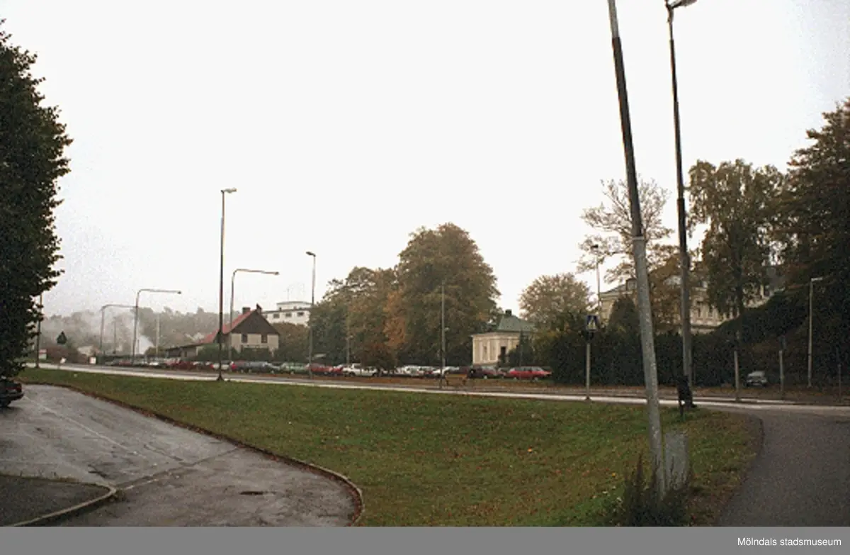 Lyktstolpar utefter Kvarnbygatan. I fonden skymtar Papyrus. Mölndalsbro i dag - ett skolpedagogiskt dokumentationsprojekt på Mölndals museum under oktober 1996. 1996_1153-1171 är gjorda av högstadieelever från Kvarnbyskolan 9D, grupp 2. Se även 1996_0913-0940.