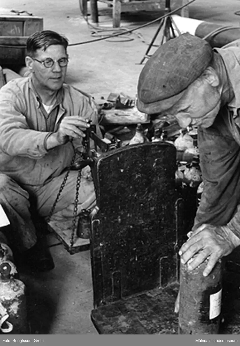 Två män gör invägning av katalysator på fabriken, år 1943-1946 på SOAB-Svenska Oljeslageri AB, Kvarnbygatan i Mölndal.