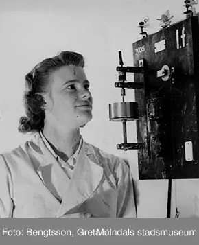 En kvinnlig laborant mäter syratal och viskositet, år 1943-1946 på SOAB-Svenska Oljeslageri AB, Kvarnbygatan i Mölndal.