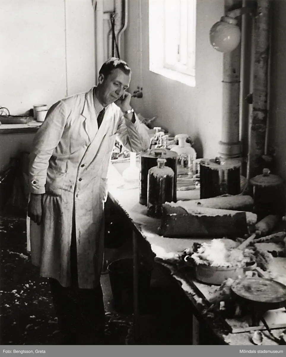 "Så kan det gå!" Ingenjör Karl-Erik Andersson vid lab-bänken, år 1943-1946 på SOAB-Svenska Oljeslageri AB, Kvarnbygatan, Mölndal.