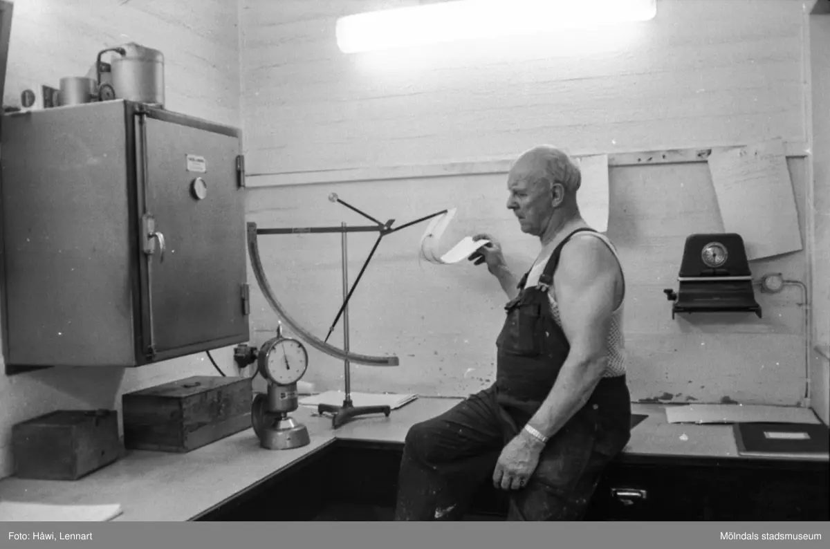 Adolf Christensson, i arbete vid mätinstrument. Han väger ett pappersark och kontrollerar gramvikten. Nya prover togs varje gång en rulle byttes ut på maskinen. KM 11, byggnad 6. Pappersbruket Papyrus i Mölndal, hösten 1970.