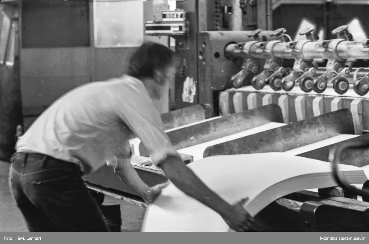 Män i arbete vid klipp i byggnad 6 på pappersbruket Papyrus i Mölndal, hösten 1970. Mannen lyfter ur arken ur KM 2. Bunten väger c:a 30 kilo.