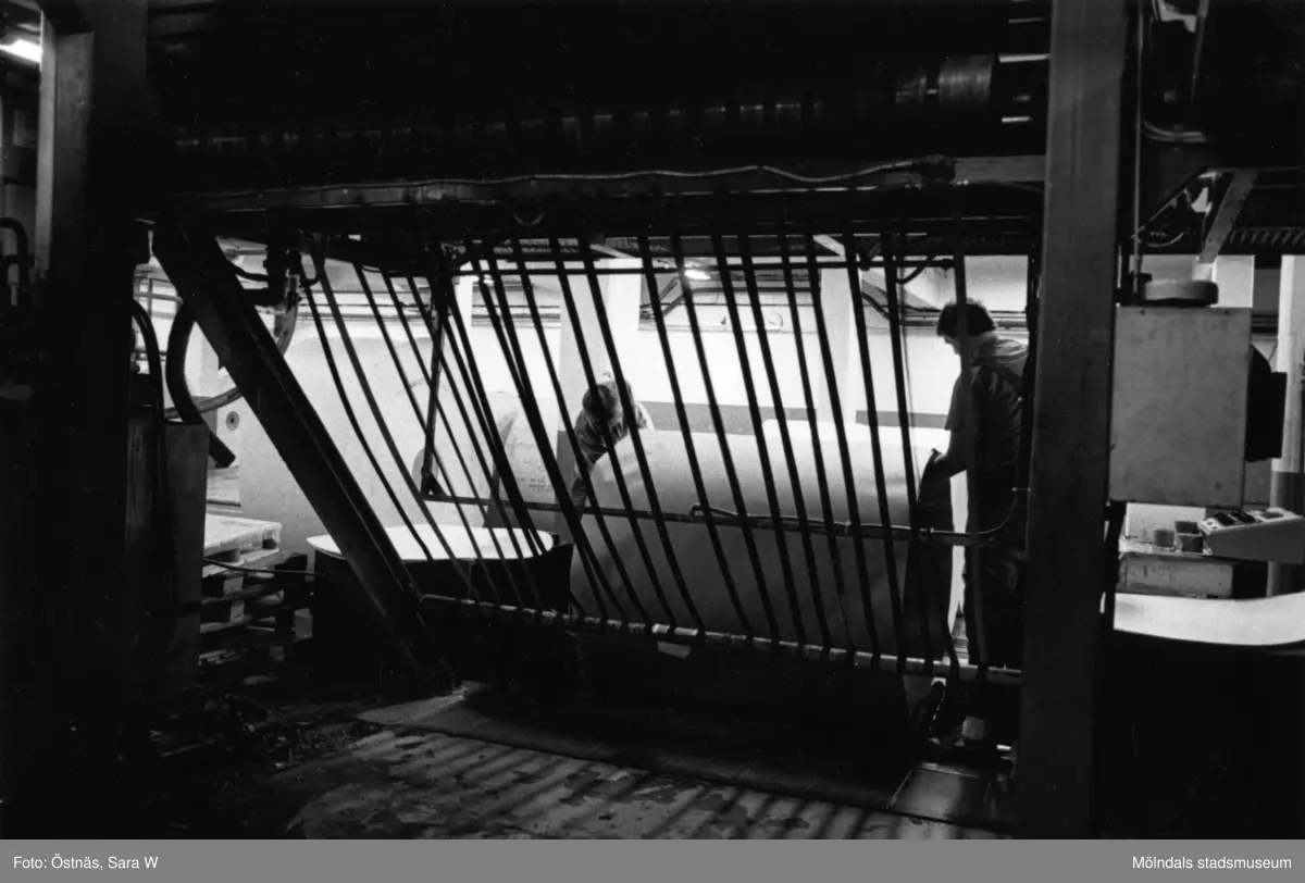 Lennart Landh och Stefan Roslund rullpaketerar kartongrullar på pappersbruket Papyrus i Mölndal, år 1990. Byggnad 6.