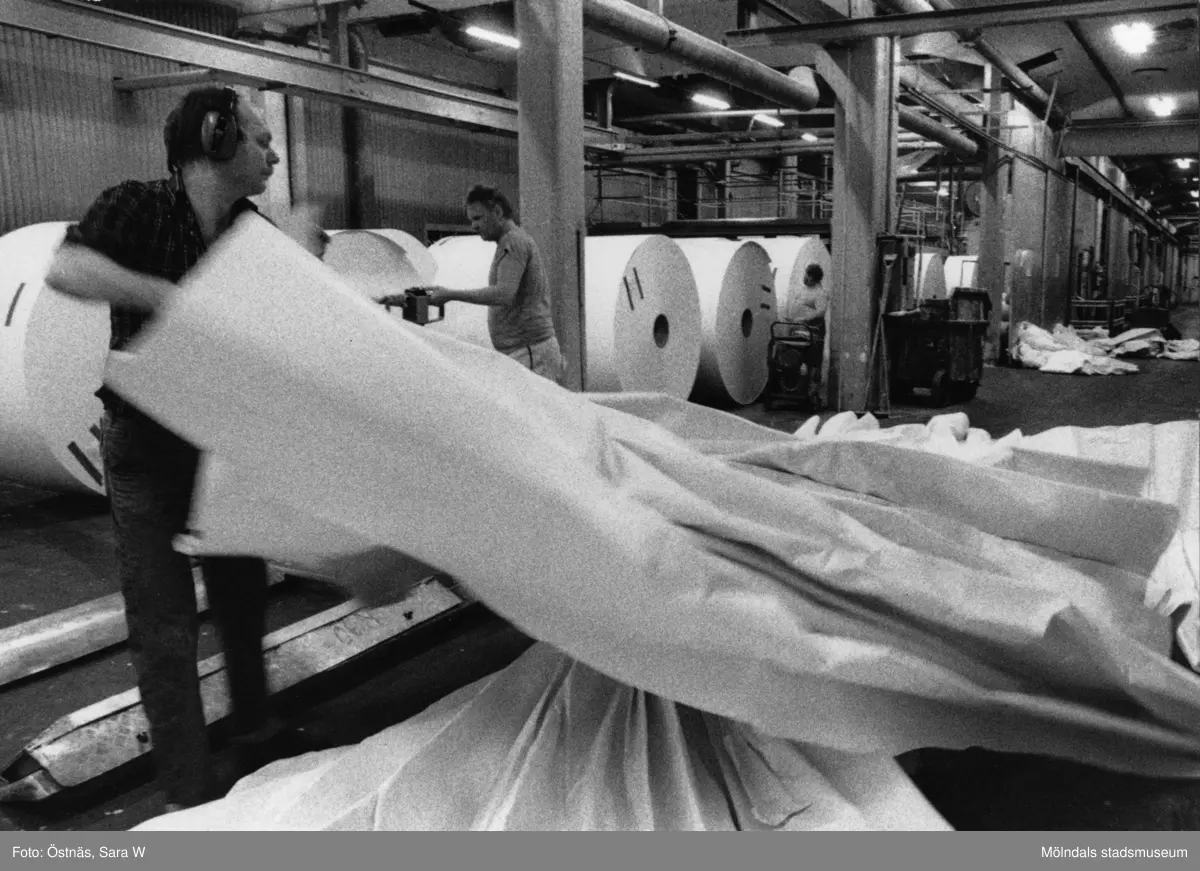 Banbrott på pappersbruket Papyrus i Mölndal, år 1990. Byggnad 6, KM 2. Denny Andersson och Kent-Erik Pettersson.