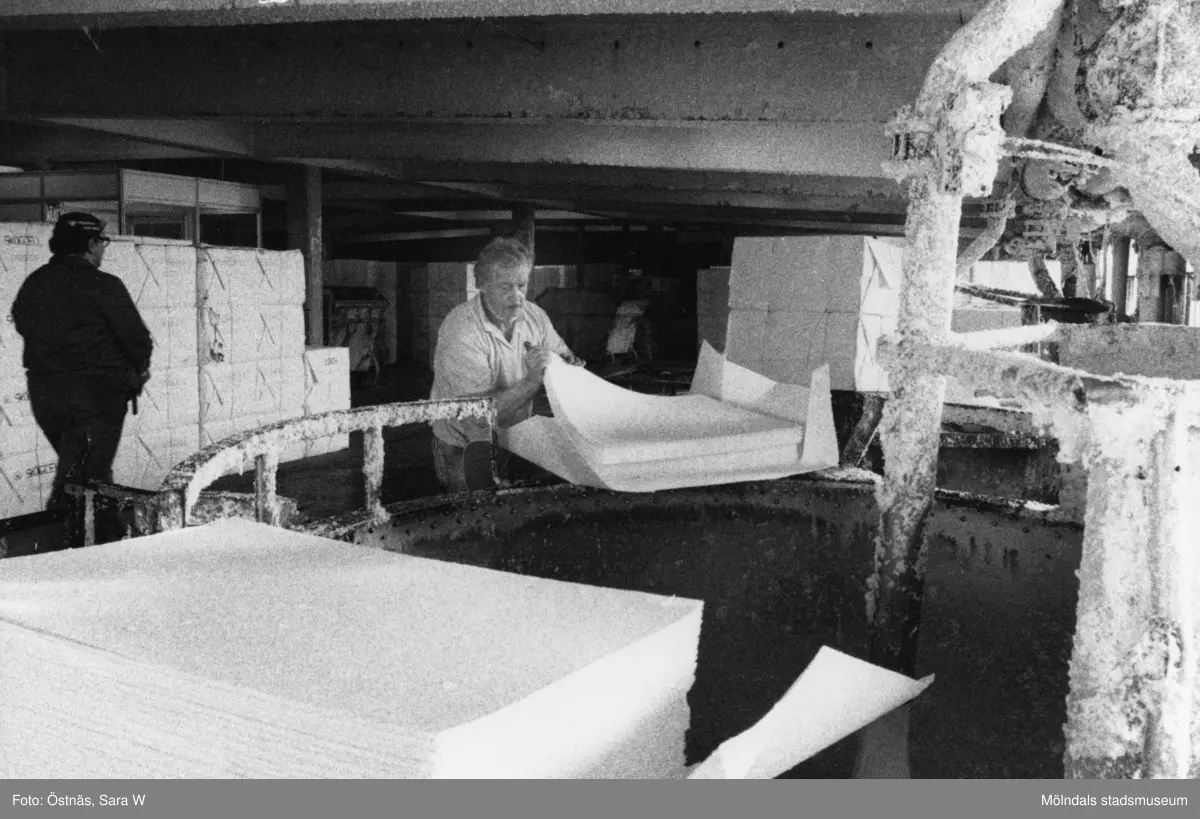Femte våningen, byggnad 6 på pappersbruket Papyrus i Mölndal, år 1990. Mannen i mössa är Erik Rotgren och mannen till höger är Stig Andersson, han löser upp pappersmassa i en pulper/pappersupplösare.