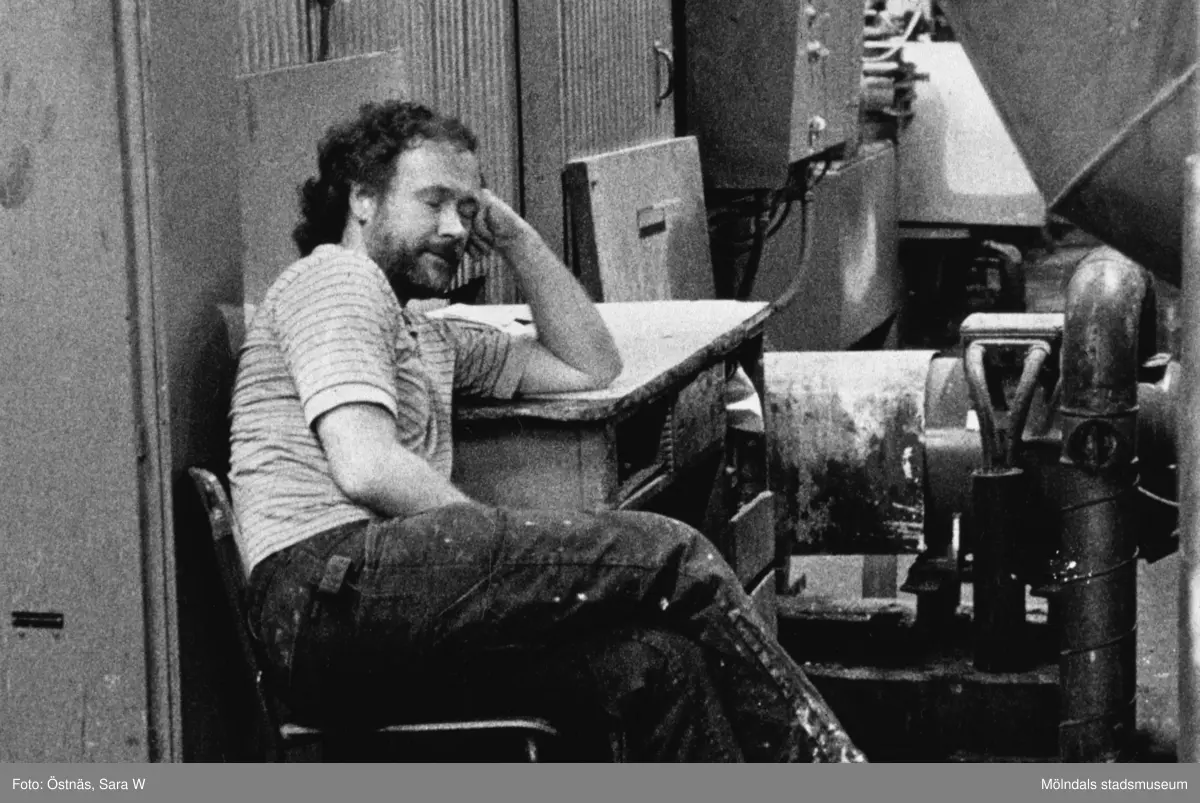 Juris Kuvalds tar en liten rast från arbetet på pappersbruket Papyrus i Mölndal, år 1990. Byggnad 6.