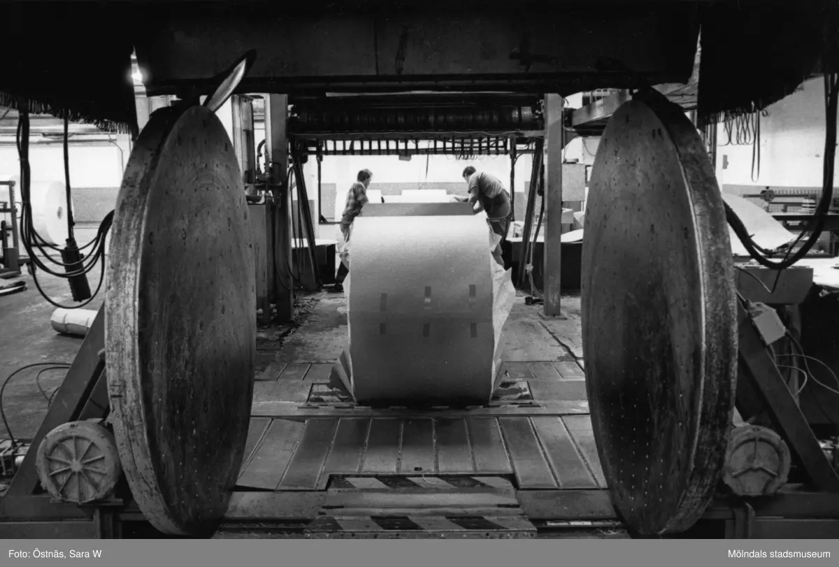 Lennart Landh och Stefan Roslund rullpaketerar kartongrullar på pappersbruket Papyrus i Mölndal, år 1990. Byggnad 6.