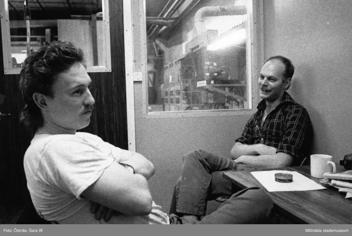 Roger Techel och Denny Andersson har rast på pappersbruket Papyrus i Mölndal, år 1990. Byggnad 6, rastkur.