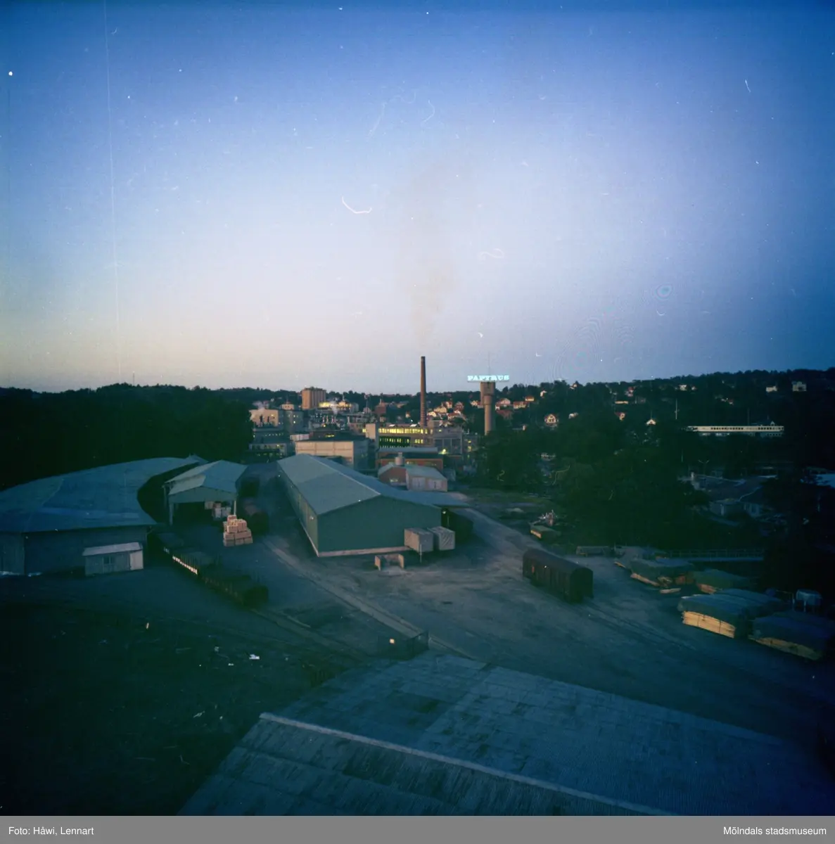 Vy över pappersbruket Papyrus fabriksområde på kvällen. Mölndal, 8/9 1970.