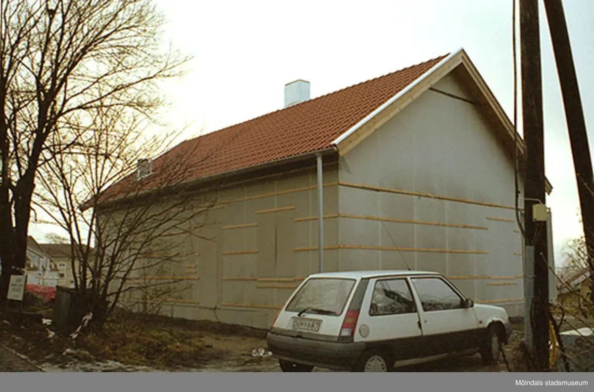 Byggnadsdokumentation. Vy från öster på en villa uppförd i Sörliden, Kvarnbyn, 1998. Byggd av återanvänt material från en tjänstemannavilla på Papyrusområdet. Oktober 1998 - januari 1999.