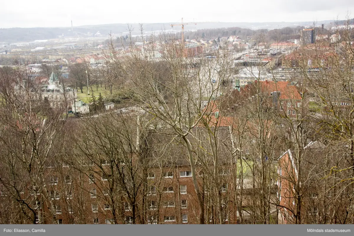 Vy från Störtfjället över stora delar av centrala Mölndal. Närmast i bild ligger bostadsområdet Silverskatten i rött tegel. Bakom detta, snett ovan till höger, ligger Kvarnbyskolan. Till vänster i bild ser man det pampiga "slottet" som en gång i tiden var Papyrus disponentvilla, idag förvaltat av företaget Forever Living. I fonden till vänster ligger Åbyområdets lägenheter i gult tegel. Den skogsbeklädda kullen bakom höghuset på Storgatan är Åbykullen.