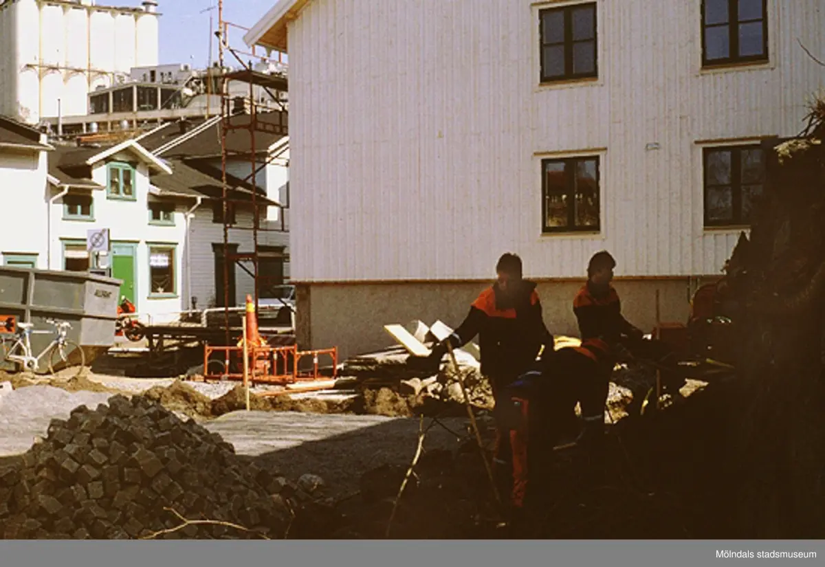 Grävarbete vid Lyktplatsen i Kvarnbyn, april 1993. Till vänster ses Kråkans Krog och till höger bostäderna på Götaforsliden 4 (Korndal 2). I bakgrunden ses Soabs vita silotorn.