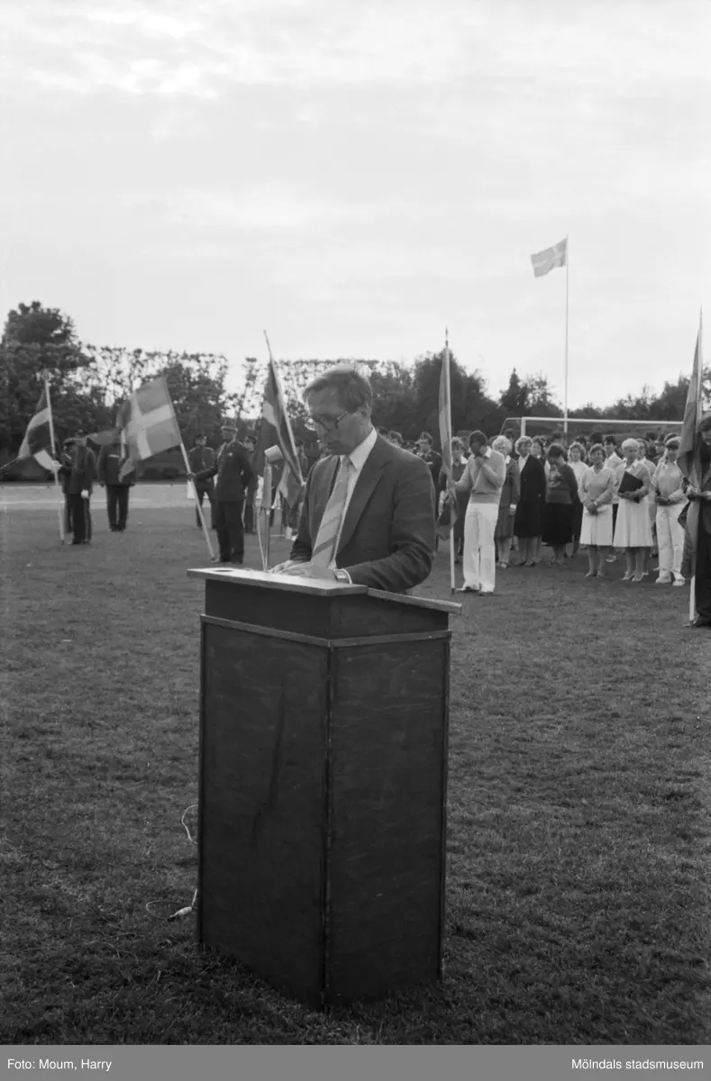 Nationaldagsfirande på Kvarnbyvallen i Mölndal, år 1984. Kommunalråd Melker Strand i talarstolen.