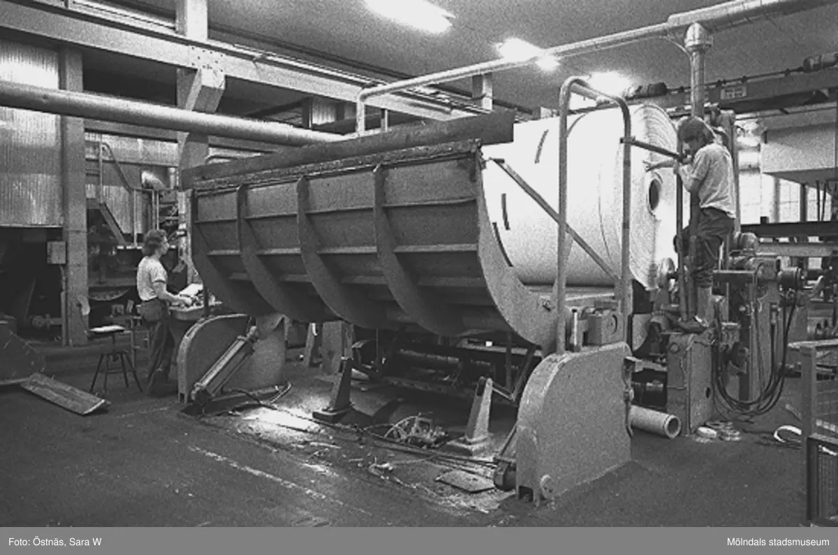Bo Ternmalm (till vänster) och troligen Jukka Rissanen i arbete med kartongrullmaskin, i Byggnad 6. Bilden ingår i serie från produktion och interiör på pappersindustrin Papyrus, 1980-tal.