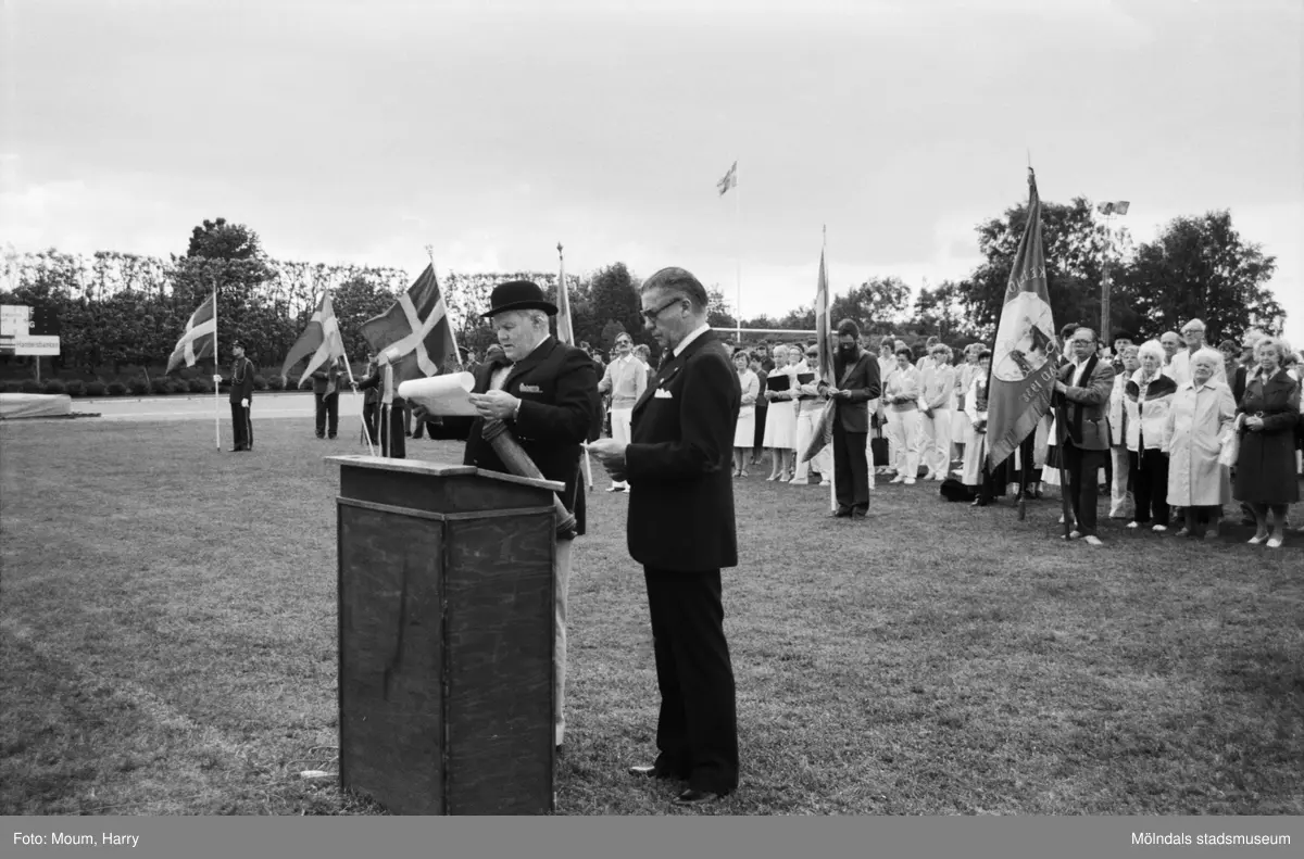 Nationaldagsfirande på Kvarnbyvallen i Mölndal, år 1984. "Åke Gillebrandt från Kals Åden läser sitt tal och Berthold Wiklund lyssnar."