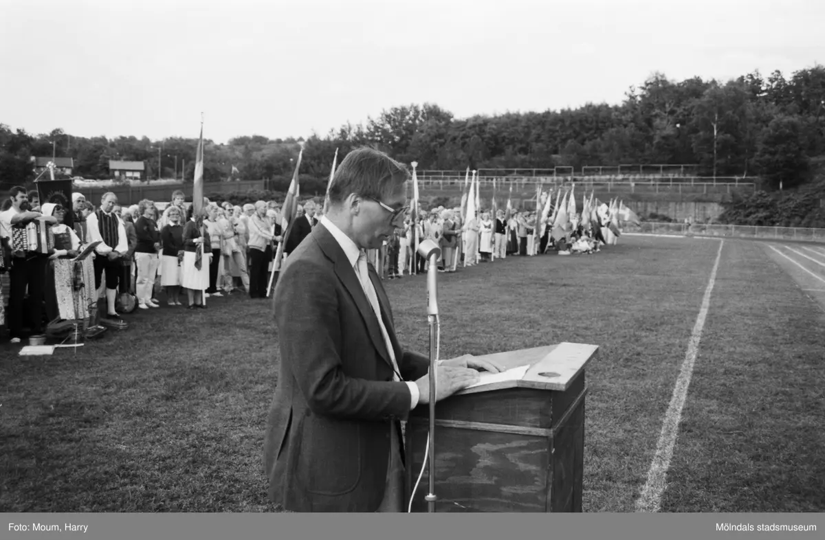 Nationaldagsfirande på Kvarnbyvallen i Mölndal, år 1984. "Kommunalråd Melker Strand talar på svenska flaggans dag på Kvarnbyvallen."