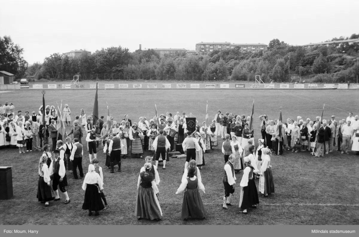 Nationaldagsfirande på Kvarnbyvallen i Mölndal, år 1984. "Hällesåkers folkdanslag gör en bejublad uppvisning."