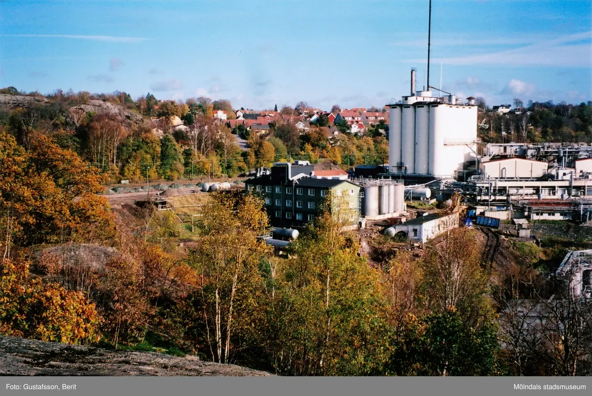 Rivningen av SOAB:s industribyggnader i Mölndals kvarnby är påbörjad, år 2008. Vy från Störtfjället.