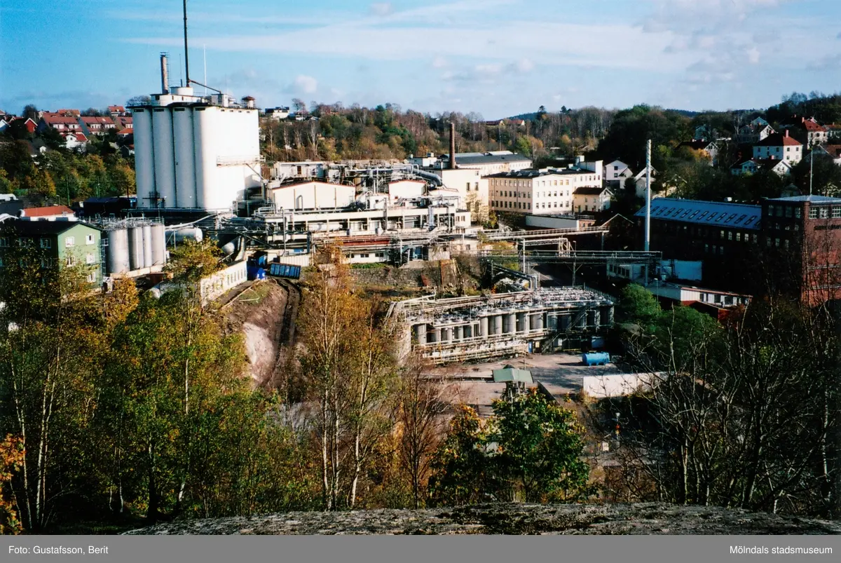 Rivningen av SOAB:s industribyggnader i Mölndals kvarnby är påbörjad, år 2008. Vy från Störtfjället.