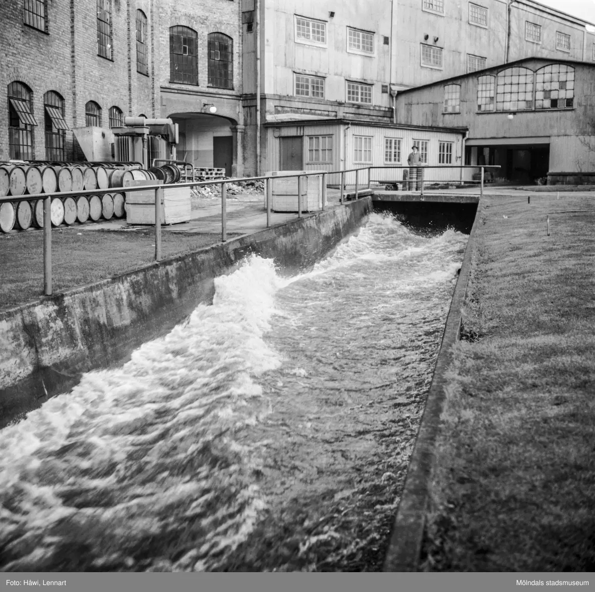 Mölndalsån inom Papyrus fabriksområde vid byggnaden nr 19. Pappersbruket Papyrus i Mölndal, 23/1 1962.