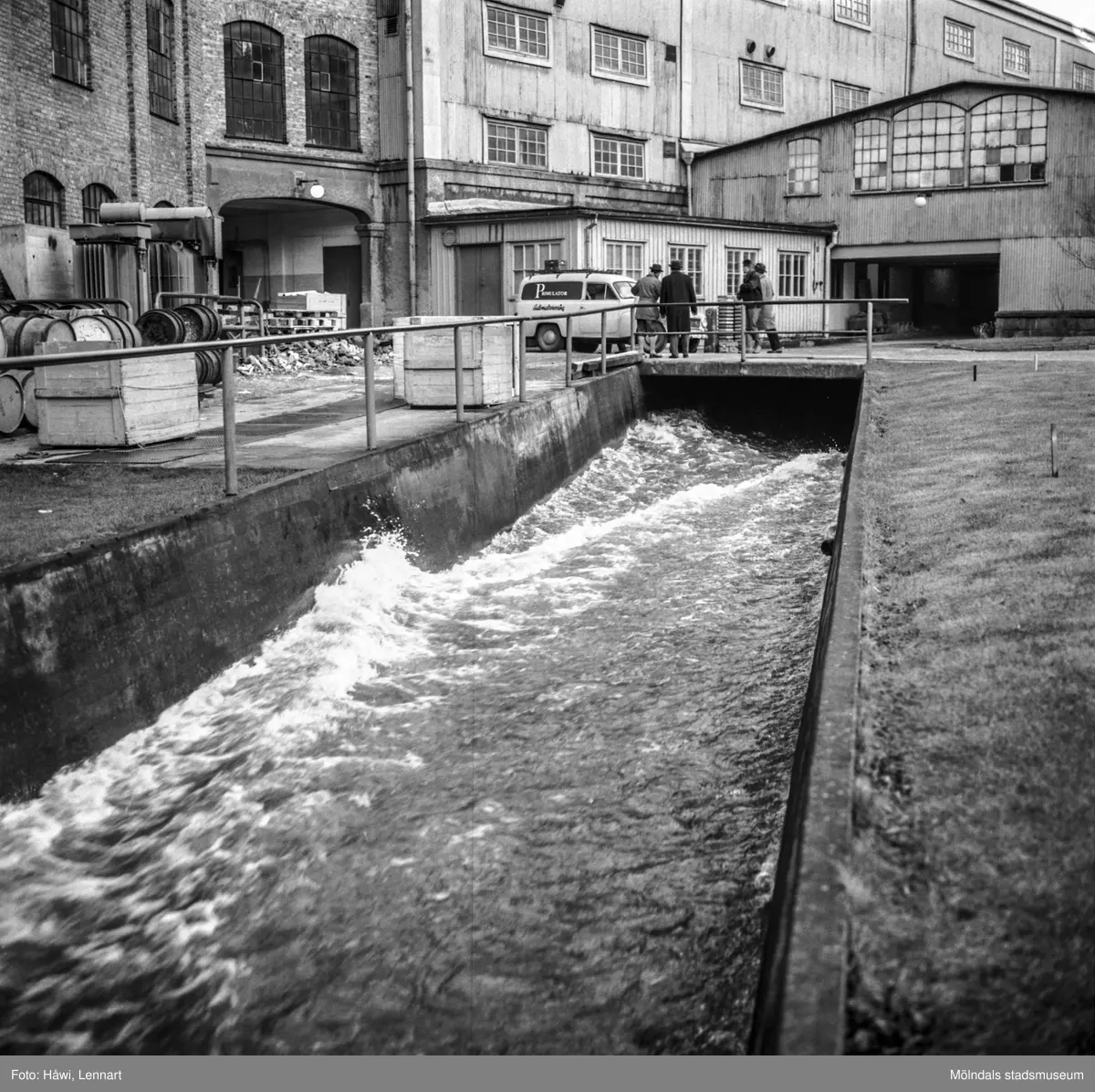 Mölndalsån inom Papyrus fabriksområde vid byggnaden nr 19. Pappersbruket Papyrus i Mölndal, 23/1 1962.
