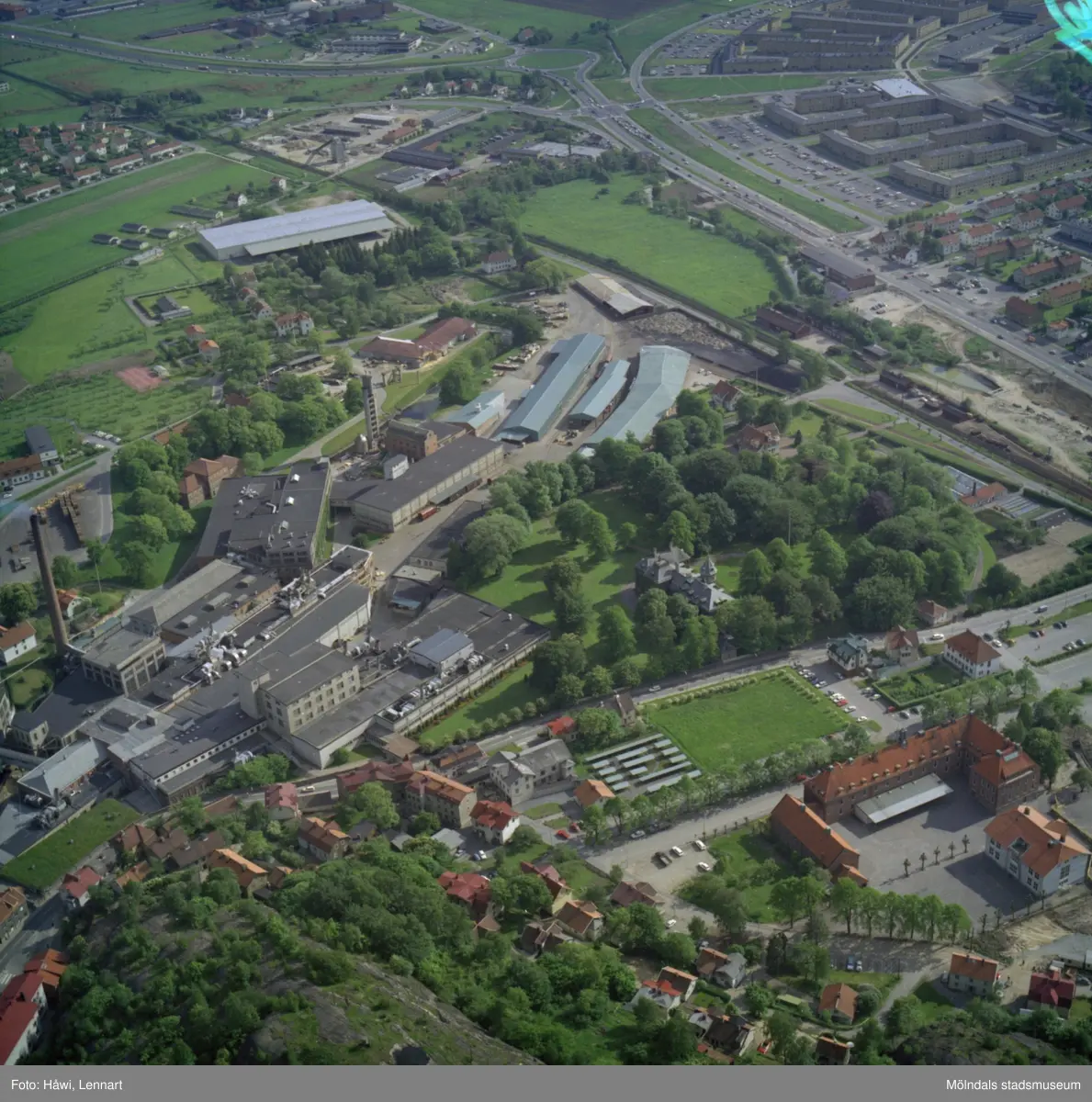 Flygfoto över pappersbruket Papyrus fabriksområde i Mölndal, 9/6 1969. I bildens vänsterkant ovanför fabriksbyggnaderna syns Yngeredsfors fruktodlingar.