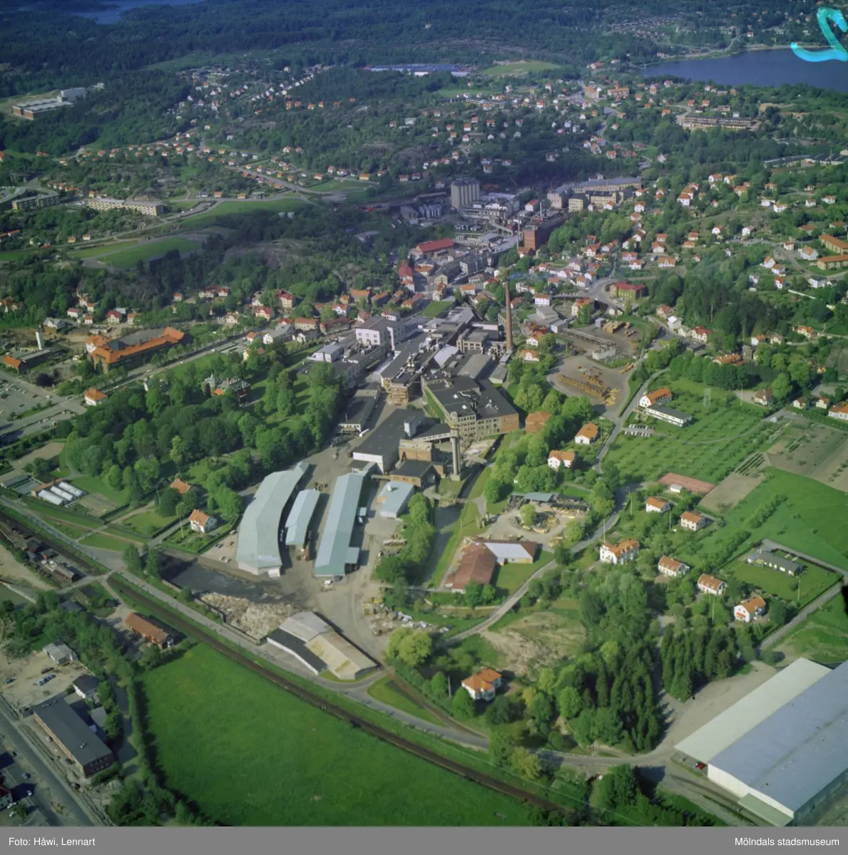 Flygfoto över pappersbruket Papyrus fabriksområde i Mölndal, 9/6 1969. Till höger om fabriksbyggnaderna syns Yngeredsfors fruktodlingar.
