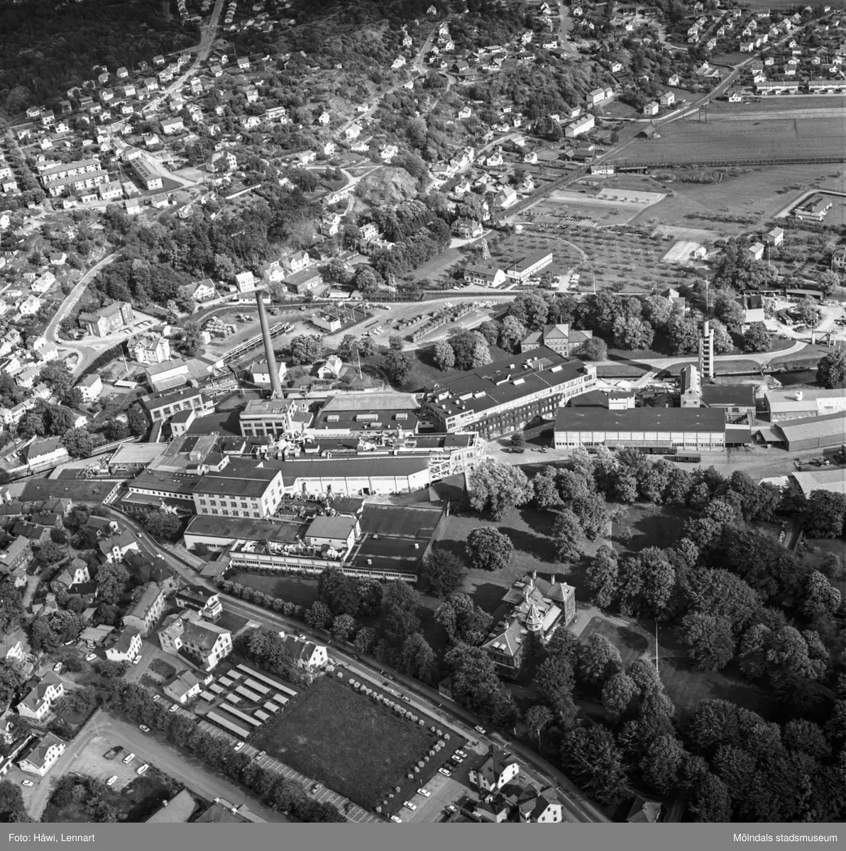 Flygfoto över pappersbruket Papyrus fabriksområde i Mölndal, 9/6 1969. Ovanför fabriksbyggnaderna, syns Yngeredsfors fruktodlingar.