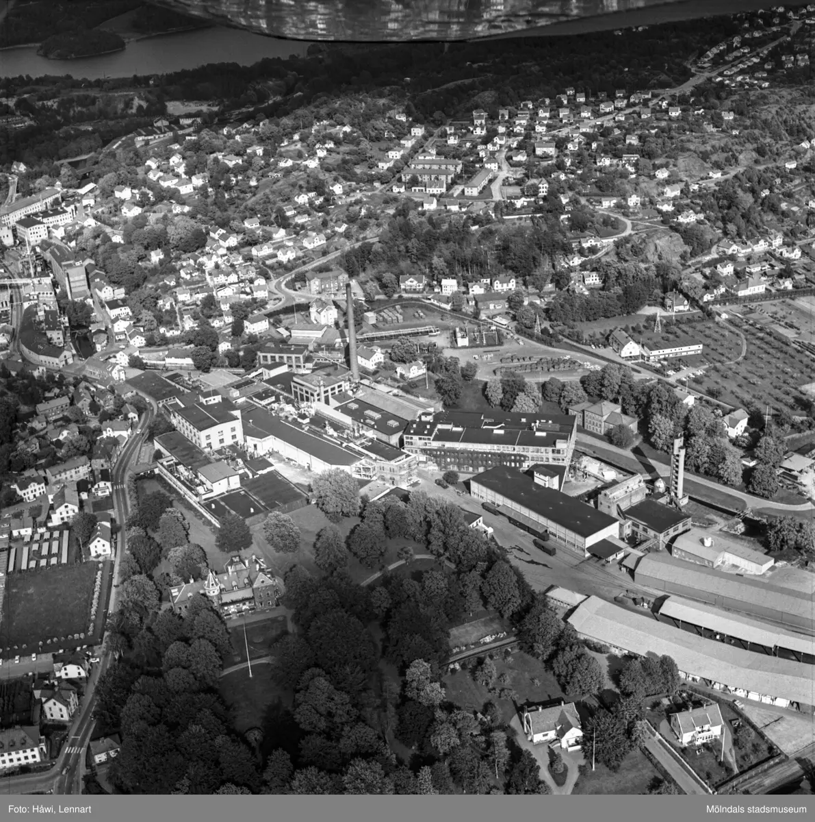 Flygfoto över pappersbruket Papyrus fabriksområde i Mölndal, 9/6 1969. I bildens kant, till höger om fabriksbyggnaderna, syns Yngeredsfors fruktodlingar.